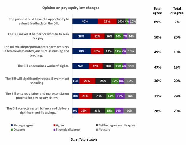 Overall, respondents thought that New Zealanders should have had a say on the pay equity law changes and that the changes will make it harder for women to seek fair pay. Respondents were asked to disagree or agree with a series of statements about the bill: